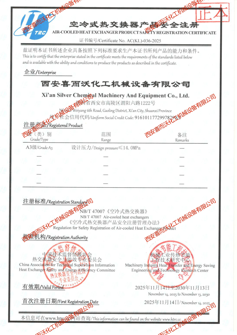 空冷式熱交換器產(chǎn)品安全注冊證